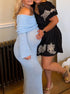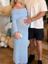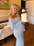 Beaumama robe longue de maternité élégante moulante en tricot bleu à épaules dénudées