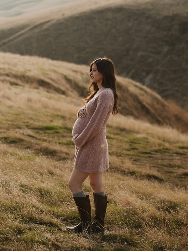 Beaumama robe pull courte grossesse élégant chic tricot torsadé trapèze manchon de lanterne femme enceinte