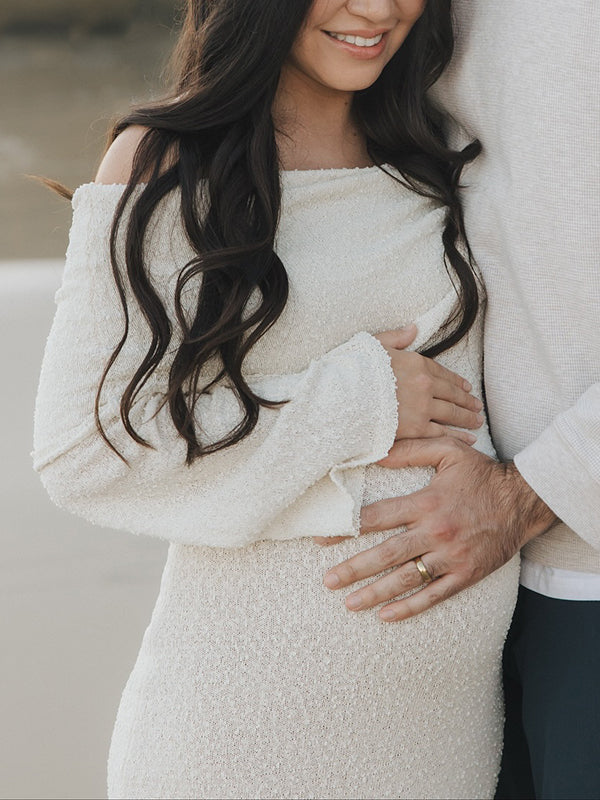 Beaumama robe shooting longue grossesse chic vacances crochet tricot épaule dénudée femme enceinte