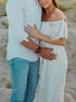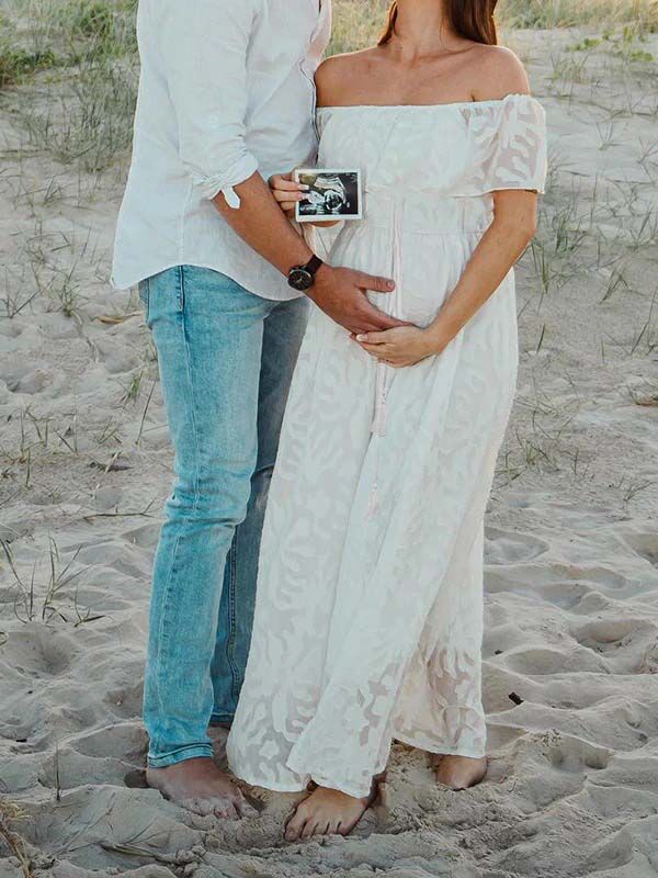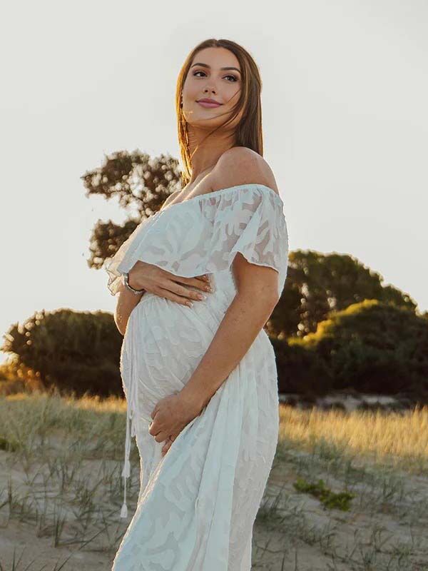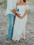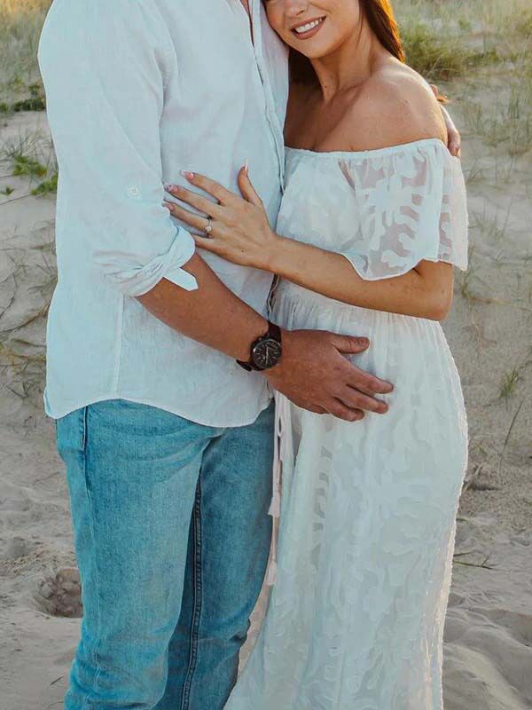 Beaumama robes photo longue grossesse élégant chic imprimé fleurie fendu le côté volants épaule dénudée femme enceinte